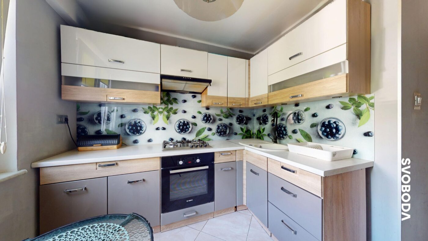 Kuchnia jest w pełni wyposażona, z nowoczesnymi meblami na wymiar oraz sprzętem AGD w zabudowie – piekarnikiem, płytą gazową, okapem oraz dużą lodówką. Na ścianie znajduje się kolorowa grafika szklana z motywem owocowym, która nadaje wnętrzu charakteru. Przy oknie umieszczono stolik śniadaniowy z krzesłami, co zwiększa komfort codziennego użytkowania.Salon jest przestronny i dobrze doświetlony dzięki dużym oknom oraz drzwiom balkonowym prowadzącym na balkon. Ściany są pomalowane w neutralnych kolorach, a na podłodze położono panele. Miejsce to oferuje wiele możliwości aranżacyjnych.