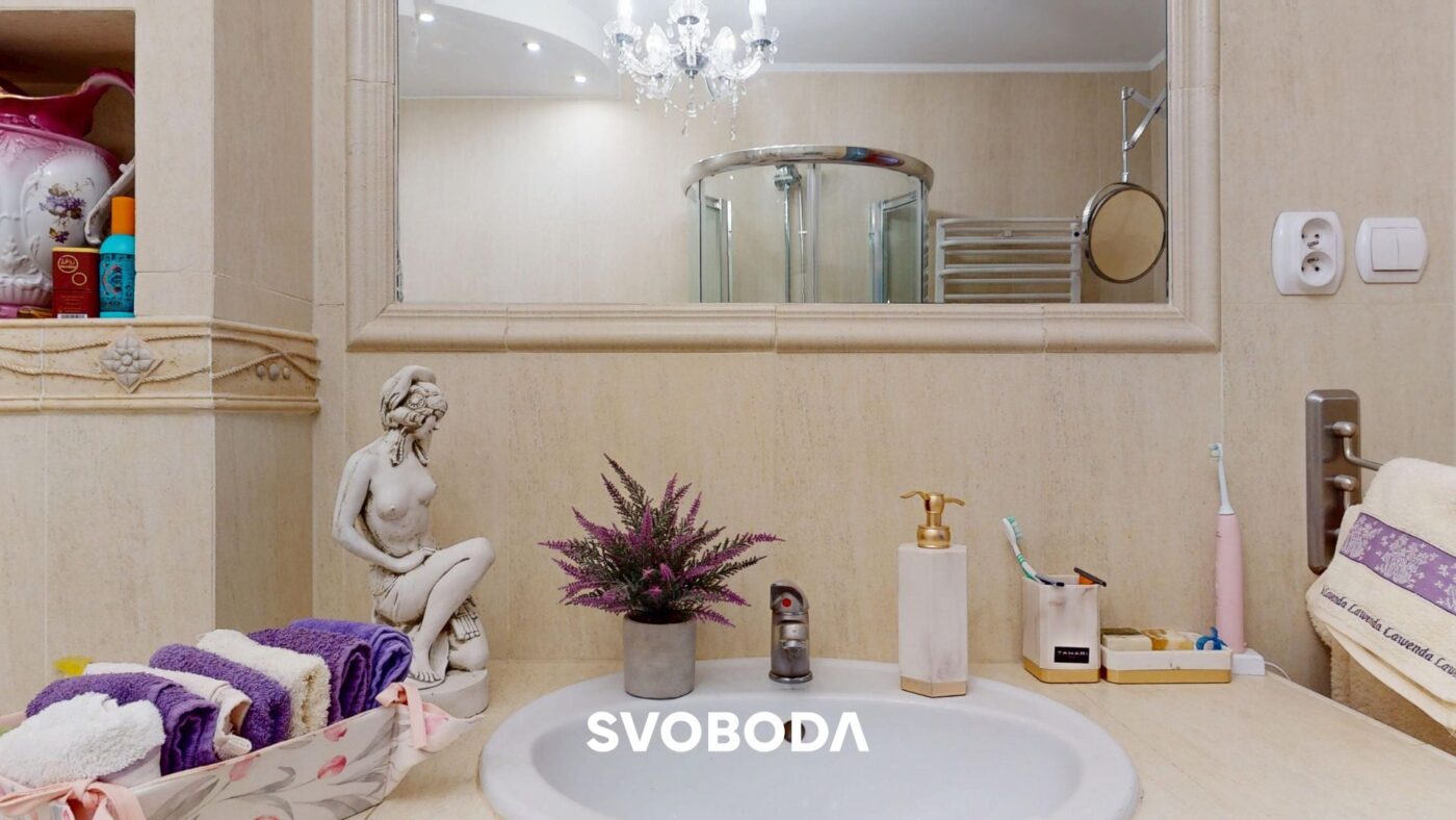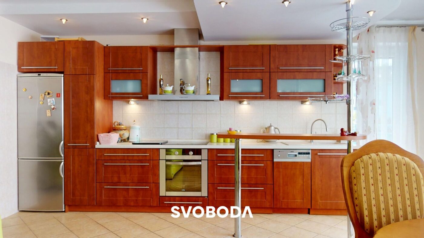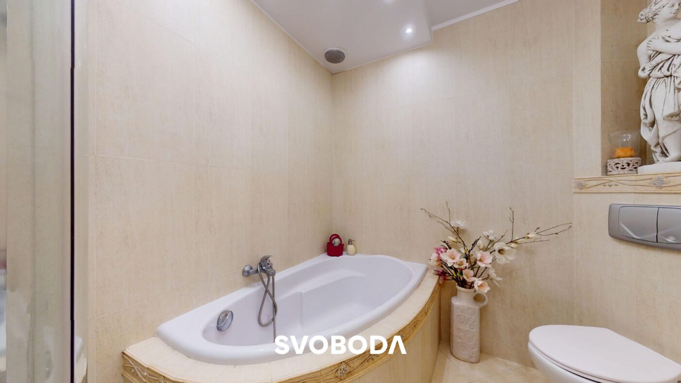 Kuchnia wyposażona jest w stałą zabudowę meblową w kolorze ciemnego drewna oraz sprzęt AGD w zabudowie: płytę grzewczą, piekarnik, okap, zmywarkę i lodówkę. Blat jest laminowany, a ściana nad nim wykończona płytkami.Łazienka utrzymana jest w klasycznej stylistyce i wyposażona w kabinę prysznicową, narożną wannę, podwieszaną toaletę, bidet oraz umywalkę w zabudowie meblowej z lustrem i oświetleniem.
